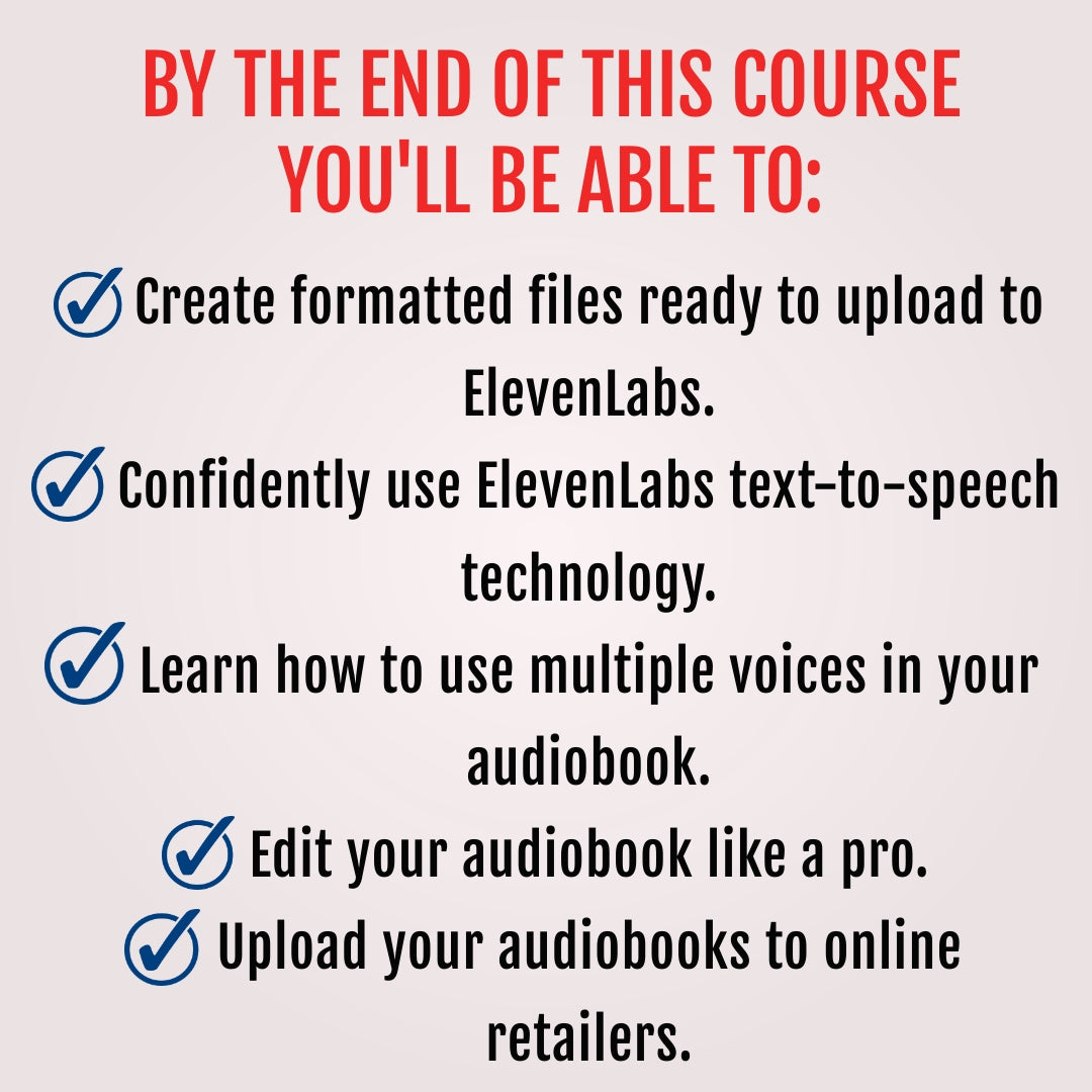 Join Leeanna, a USA Today bestselling author, in this hands-on, comprehensive course where you’ll learn how to produce high-quality audiobooks using ElevenLabs to reach new audiences and boost your sales potential!